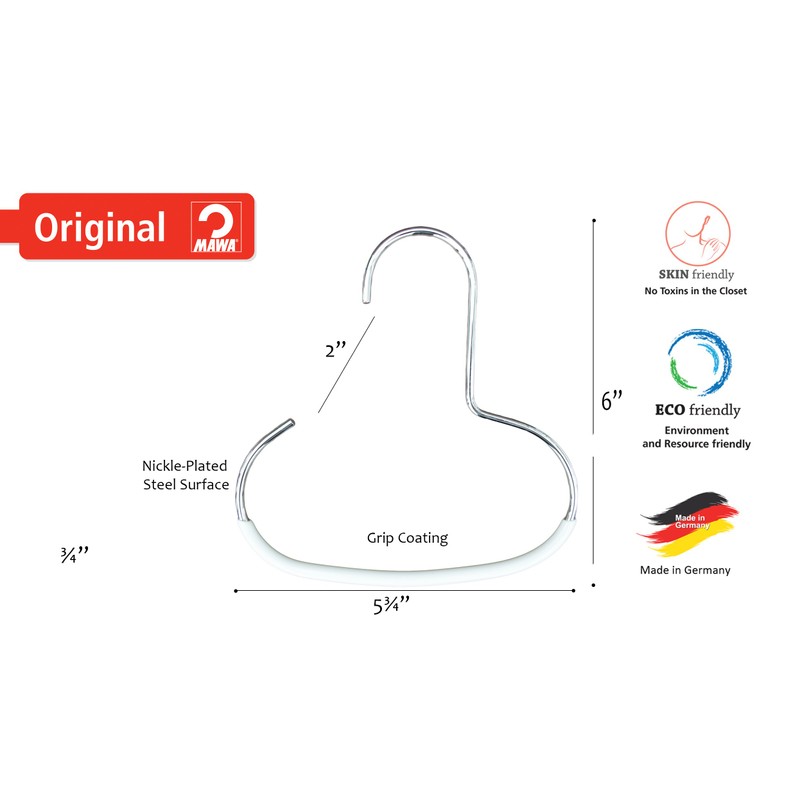 In 1948 Martin Wagner had the vision to manufacture the best clothes hanger in the world. That dream became a fully automated manufacturing process that combines specialized machinery, professional designers/engineers, and experienced sales staff. Mawa pioneered the market with patented technology such as turn able hooks, anti-slip coating, and clip hangers. Mawa delivers 100percent "made in Germany" clothes hangers to 58 countries to ensure high quality materials and designs are offered throughout the world. Managing director, Michaela Schenk has made consumer safety her top priority. All materials used for production can be recycled and water consumption in the manufacturing process has been reduced by 80percent . Mawa is environmental friendly and certified in accordance with Germany's strict ecologic standards. The culmination of European standards and Mawa dedication to high standards, results in a product which is not hazardous to the customer or planet. Our scarf hook has a handy wide opening to help organize multiple scarfs or accessories with one hook. The non-slip coating keeps items in place and creates a uniform look to your closet. Your clothes do not need to suffer, and neither does your wallet. Take care of your clothes by using the Mawa line of hangers. Save space, get organized and treat your garments & yourself with the utmost care.