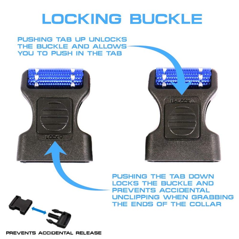 - QUALITY CONSTRUCTION: Our nylon martingale collar is 1" wide (5/8" XS, 1.5" XL size) and made with a 2mm nylon. We use a heavy duty nylon snap buckle that has a lockable tab to prevent accidental release. We use a thick D-ring which has a polished metal finish. A separate plastic tab is provided to hang dog tags and charms. The collar has a 2 wide reflective stitching bands which increase its visibility during night time walks.