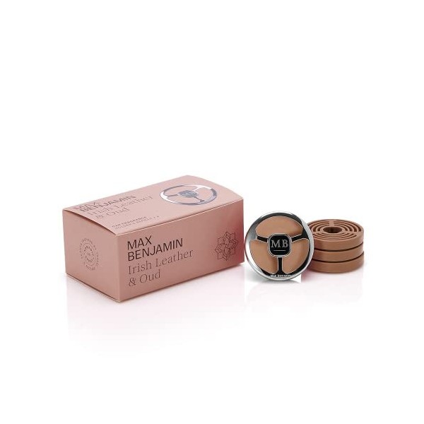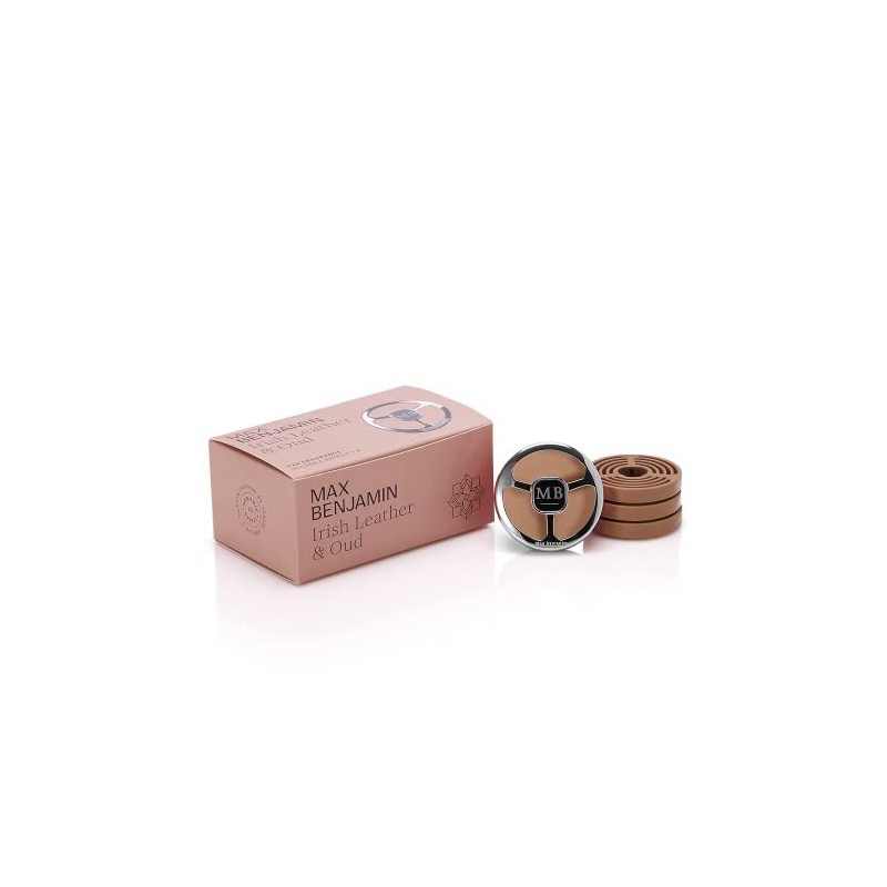 • A fragrance dispenser gift set for your car with the wonderful Irish Leather & Oud fragrance and four refills of Max Benjamin
