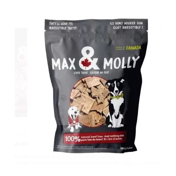 Max & Molly Liver Treats are high quality, palatable treats for dogs. Treats consist of quality beef liver that has been cut into small, bite-sized pieces. The beef liver undergoes a gentle cooking phase followed by a freeze-drying process. Using this manner of preservation maintains the stability and freshness of the treats without the need for ultra-high temperature processing or chemical preservatives. The beef liver retains its natural nutritional qualities and delicious flavor throughout the entire package.- A great source of iron, vitamins A, B9, B12 and high quality proteins in a low calorie treat