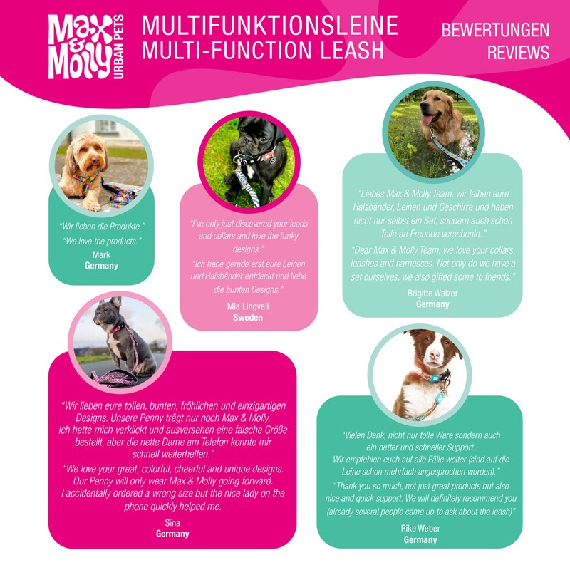 - Description: The Max & Molly multifunctional lead is available in 4 different sizes (XS - L) but is always 200 cm long. 3 additional rings allow you to use the lead in multiple ways e.g. as a shoulder lead, hip lead, short lead, long lead and much more. Practical accessories can of course also be attached to one of the rings. With our selection of many colourful designs, your dog is sure to attract everyone's attention.