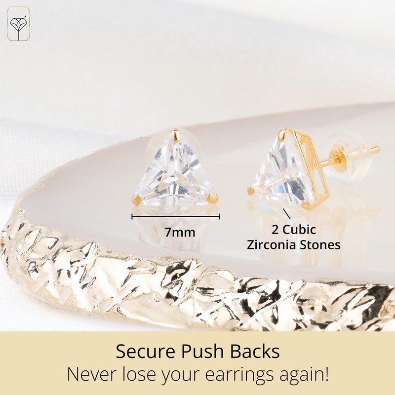 - CUBIC ZIRCONIA: The stud earrings gold feature 2 brilliant CZ stones in a unique trillion cut for those who want to stand out while keeping it elegant and classy.