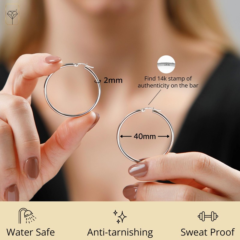 - SOLID 14K GOLD - These 14k white gold hoop earrings for women are 2mm thick & made of real gold and stamped with "14K" on the clasp to ensure authenticity. Real gold hoop earrings are great for sensitive skin and will not tarnish over time, even in water!