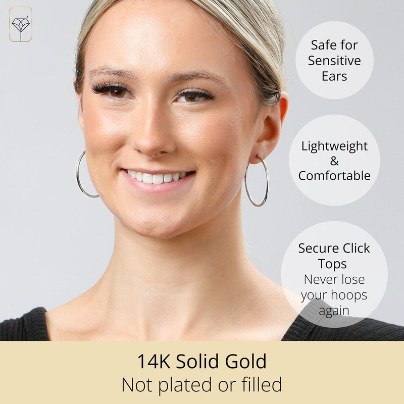 - GOLD HOOPS - Lightweight & large gold hoop earrings for women 14k real gold measure 40mm (1.5 inch). Solid gold hoop earrings have click top closures, when closing make sure to hear the 'CLICK to know the white gold hoops are correctly clasped.