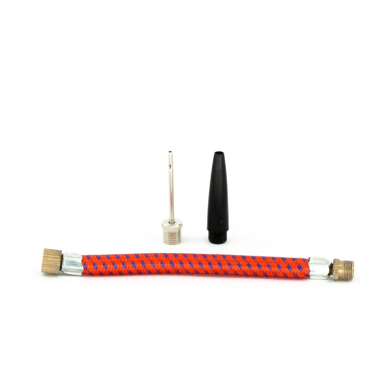 Rapid Plus pump: double action pump (23 cm long, 4 cm diameter) including three attachments: attachment for needle valves (valve needle), black attachment for inflating large gymnastic balls, soft balls and Pilates balls as well as a coated, flexible hose for extending and protecting the valve needle against breaking or bending.