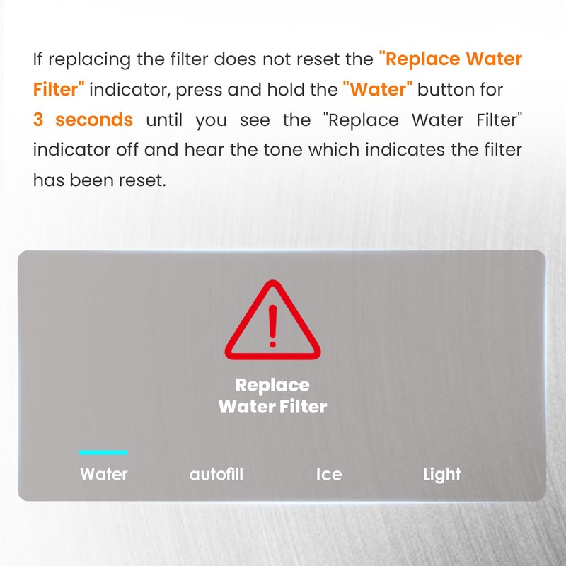 - If replacing the filter does not reset the "Replace Water Filter" indicator, press and hold the "Water" button for 3 seconds until you see the "Replace Water Filter" indicator off and hear the tone which indicates the filter has been reset.