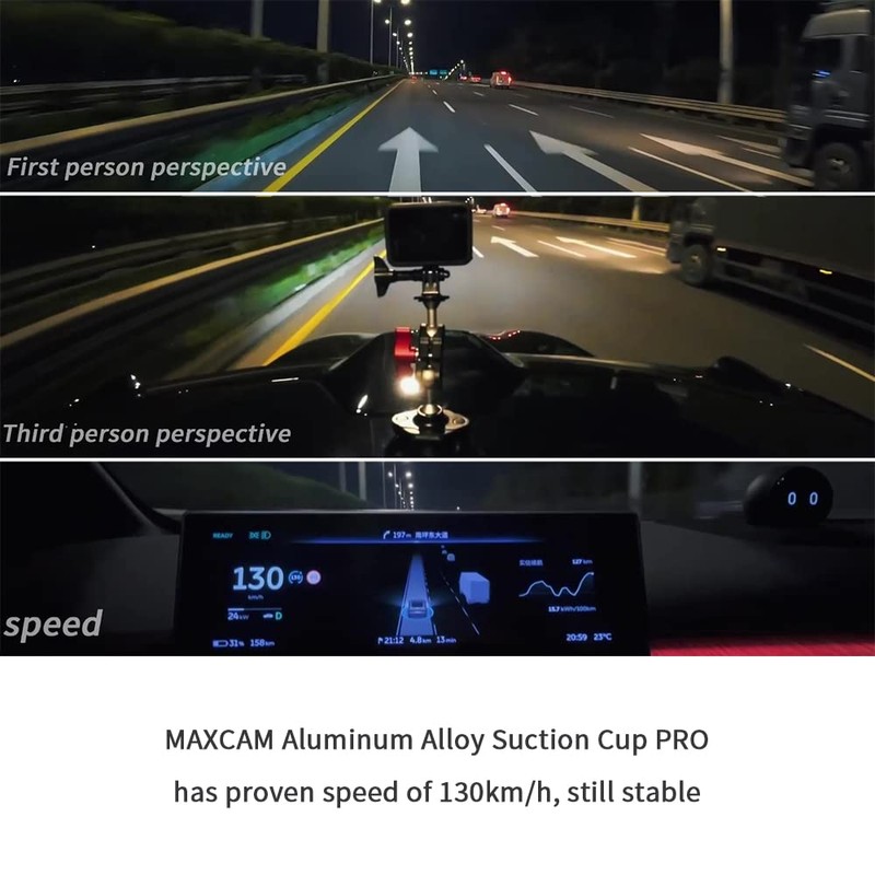 - MAXCAM Aluminium alloy suction cup PRO has proven speed of 130 km/h, still stable.