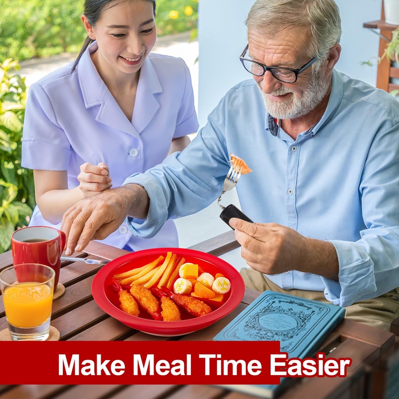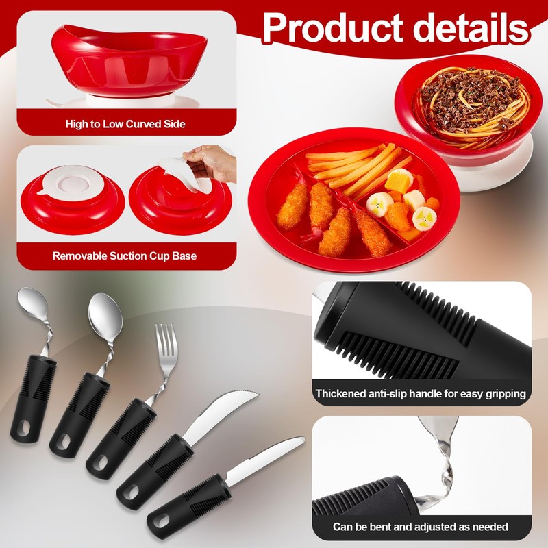 - Unbeatable Quantity: enjoy a sufficient quantity of adaptive self feeding dinnerware; Each package includes a set containing 2 pcs of bowl and plate, plus a 5 pcs adaptive utensil set, 3 of which are adaptable and bendable for your convenience