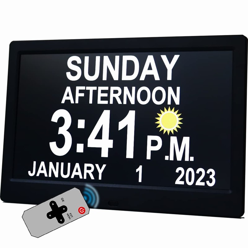 This 11.5 inch digital clock with date and Day of the week is purposedly developed to help the elderly people or school-age kids with trouble of reading regular clocks, visually impaired, Alzheimers' and Dementia; Or setting up reminders for them to accomplish their daily tasks.