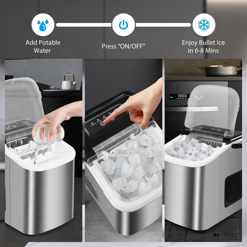 - Simple Operation: The bullet ice maker has simple control panel and smart sensor. Enjoy fresh ice with 3 easy steps: Fill the water up to the maximum water level, press the on/off button, choose the ice cube size, and then just wait for fresh, delicious ice cubes. The "ICE FULL" indicator flashes remind you to take out ice to prevent overflowing when the basket is full. And it'll remind you to add water by flashing "ADD WATER"