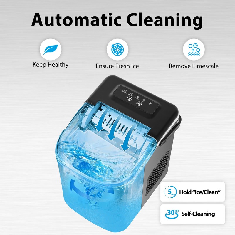 - Self-Cleaning: The compact ice maker has a one-touch auto-cleaning function. Keep your ice fresh and clean with the automatic self-cleaning function. Simply remove the basket, add water, then press the “ON/OFF” for 5s after adding water to run automatic mode for 30mins. Just get a clean ice maker without washing it by yourself and free your hands. Keep the ice cubes fresh at all times
