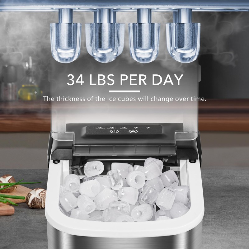 MAXEVE Ice Makers Countertop, 34LBs/24H Ice Maker, 2 Size of Bullet Ice,9Cubs in 6Mins, Portable Ice Maker Machine with Self Cleaning, Ice Basket, Ice Scoop for Home/Office/Bar, Stainless Steel Silver
