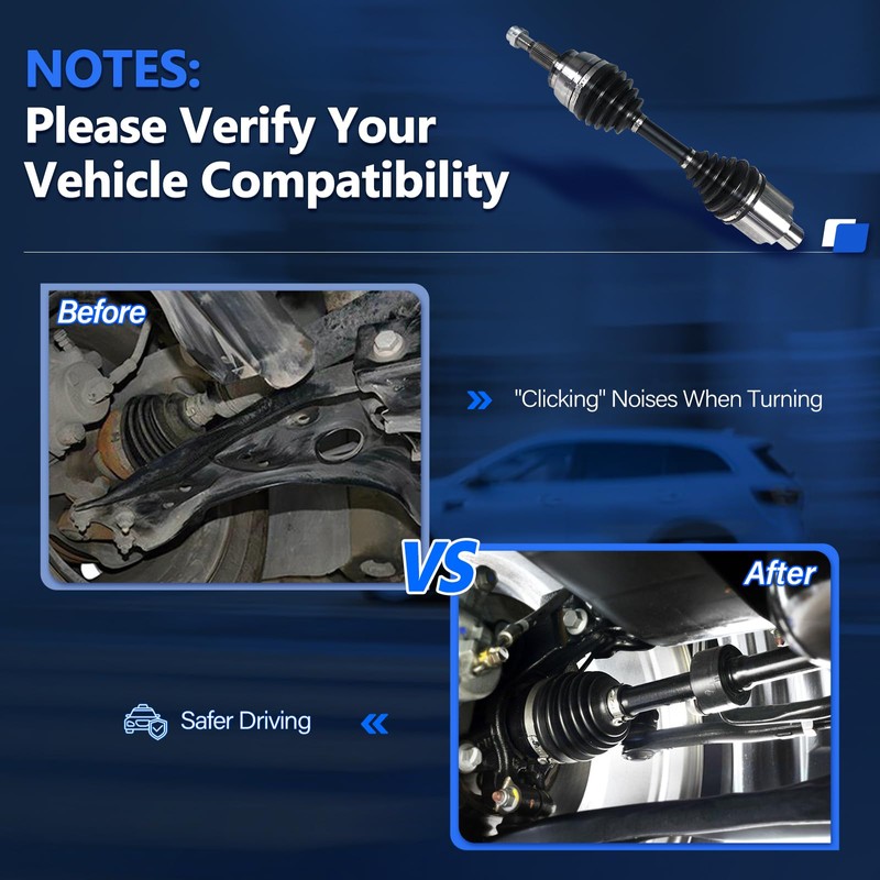 - 【Specifications】① Location: Front Left and Right (Driver and Passenger Side) ; ② ABS Ring Included: No; ③ Compressed Length: 26.30 inch (Left), 38.15 inch (Right); ④ Input Shaft Spline Count: 27; ⑤ Output Shaft Spline Count: 29