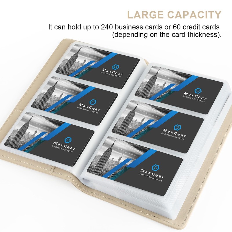 - Large Capacity: This business card book can hold up to 240 business cards or 60 credit cards (depending on the card thickness). Maximum card size suitable: 3.6" x 2.2". Applicable for note cards, business and personal cards, ID and credit cards, etc.