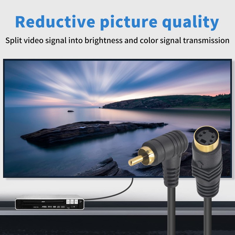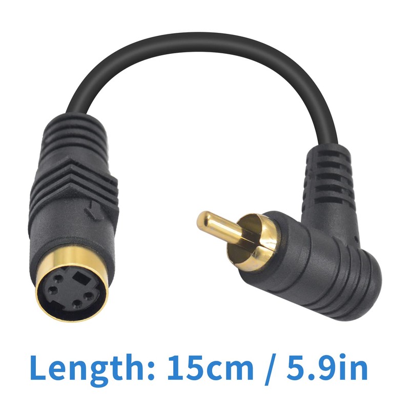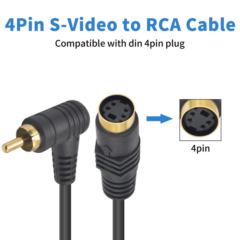 - 4pin S Video to RCA Cable: this S-Video Cable with 90 degree RCA plug, it avoid the cable bending and breaking in the wall conner, and the S-Video Plug (Female) to RCA Plug (Male) Gold Adapter is the standard 4 pin mini-DIN (M) to RCA (M).
