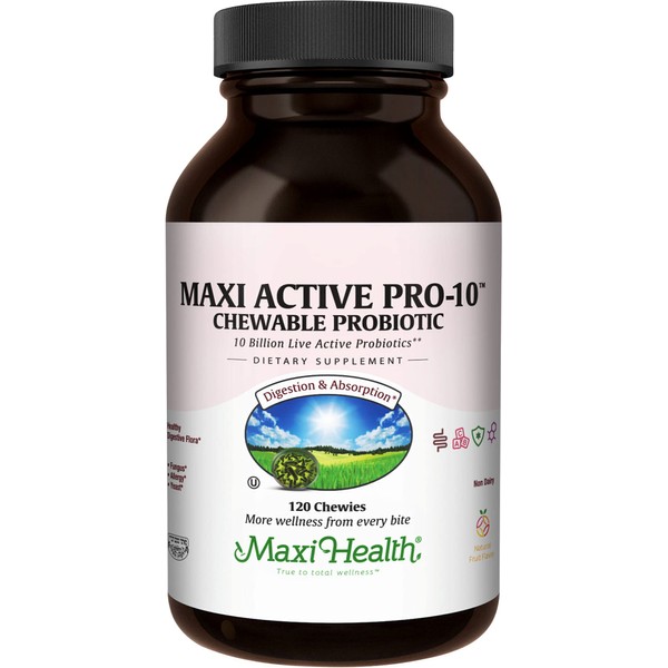 Maxi Health Active Pro-10 Kids Probiotic Chewables – 15 Strains for Digestive & Immune Health –10 Billion probiotic Blend- Dairy-Free, Kosher – Supports Gut Health, Vegetarian – 60 ct (Shelf Stable)