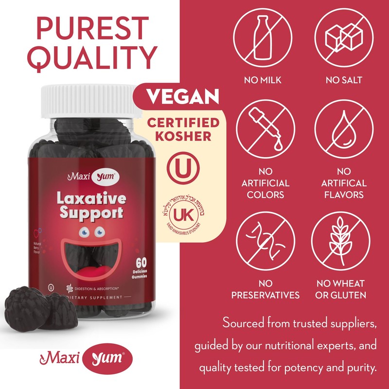 - VEGAN & KOSHER CERTIFIED - Maxi is dedicated to formulating natural laxatives for constipation with pure and high-quality ingredients. Certified Kosher and vegan-friendly. Contains no animal products, soy, wheat, gluten, yeast, salt, corn, milk, artificial flavors, colorings, or preservatives.