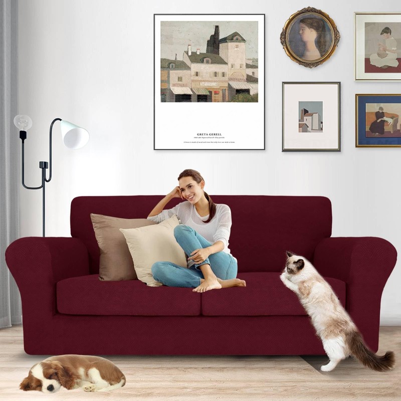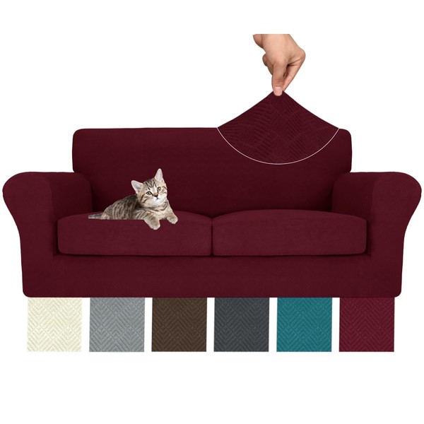 MAXIJIN 3 Piece Couch Covers for 2 Cushion Couch Sofa Cover, Stretch Loveseat Sofa Slipcovers for Sofas with 2 Large Cushions, Thick Dogs Pet Furniture Covers (71"-91", Wine Red)
