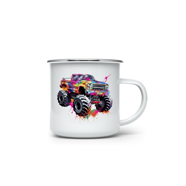 MAXIKIWI - Langlebiger Emaille-Kaffee- oder Teetasse für den Innen- und Außenbereich – Monstertruck – 350 ml