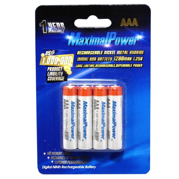 MaximalPower AAA NiMH/Ni-Mh rechargeable replacement battery 1200mAh 4 pieces per pack replaces with almost all Alkaline, Li-ion, Ni-Cd, and other Ni-Mh batteries! Batteries can be charged up to 1000 cycles. It is Ultra High Capacity and perfect for electronics that drains batteries fast. It is 100% compatible with almost all AA devices and absolutely no memory effect so that you can charge battery at anytime. ***NOTE: 1. Please correctly align polarity (+/-) before attempting to recharge your batteries; 2. Please FULLY charge your rechargeable batteries before first use. When in doubt, charge your batteries overnight (8 hours); 3. Please fully cycle your Ni-Mh batteries (fully charge, then fully discharge them) at least twice before regular use; 4. DO NOT overcharge your batteries or trickle charge for more than 24 hours; 5. DO NOT full charge your batteries before storing them for long periods of time. Discharge them as much as possible first; 6. Amazon.com is the only authorized dealer selling MaximalPower brand products. Please make sure your item is ONLY sold and shipped by Amazon.com! All other marketplace vendors are selling counterfeit products that do not perform the same, and/or are not covered by our MaximalPower Warranty.