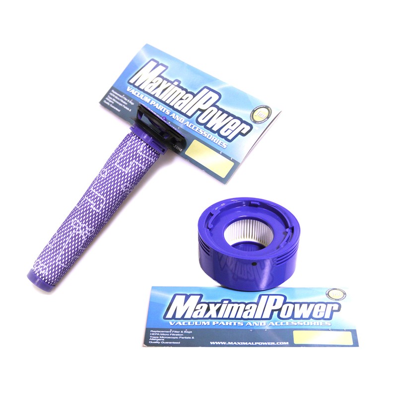 Premium quality HEPA pre- and post-filters captures specks of dirt and dust, pet dander, mold spores, pollen and other allergens from the air you breathe. Washable and reusable - simply rinse with water and let it air dry overnight before using. Saves money and energy while improving the air quality of your home for your family and pets. Fits Dyson V7 and V8 models with replacement parts # 96566101 for pre-filter and # 96747801 for post-filter. 100% compatible with original manufacturer equipment. Does NOT work with Dyson V6 models. One filter lasts for half a year and cost-efficient compared to getting Dyson OEM replacements. Replace it every six months for optimal use. USA-based brand with and Customer Service. is limited to manufacturer's defect only. Product details: - 1 pc MaximalPower Pre-HEPA Replacement Filter - 1 pc MaximalPower Post-HEPA Replacement Filter PRE-HEPA FILTER Size: 7 x 2 inches (L x W) Weight: 0. 6 OZ Color: Indigo SKU: 1885 Replacement part #: 96566101 POST-HEPA FILTER Size: 3 x 3. 5 x 2 inches (W x L x H) Weight: 2. 1 OZ Color: Indigo SKU: 1886 Replacement part #: 96747801 Compatible with: Dyson V7 Cordless Stick, HEPA, Animal Dyson V8 Cordless, Absolute