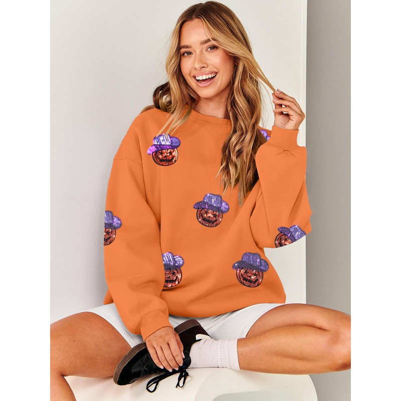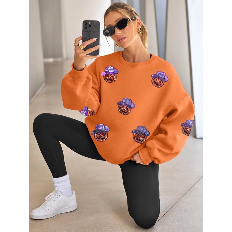 MAXIMGR Halloween Sweatshirts for Women Sequin Ghost Pumpkin Sweatshirt Funny Spooky Season Shirt Sparkle Fall Pullover Tops Orange
