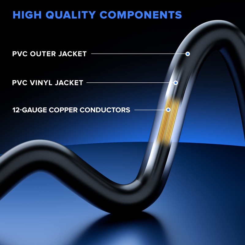 - Extension Cord Heavy Duty Splitters 16in. Main cord length: 10in, branch cord length: 6in, crafted with PVC jacket, 12-gauge copper Wires, water-resistant outdoor extension cord. SJTW rating meaning the cord is extremely tough and can resist tearing, abrasion, moisture and exposure to sunlight (avoid the plug and the outlet from getting wet)
