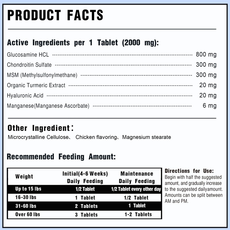 - Advanced Joint Support Formula: Each 2000mg tablet contains 800mg Glucosamine HCL, 300mg Chondroitin Sulfate, and 300mg MSM, effectively promoting cartilage repair and enhancing joint health and flexibility in dogs.