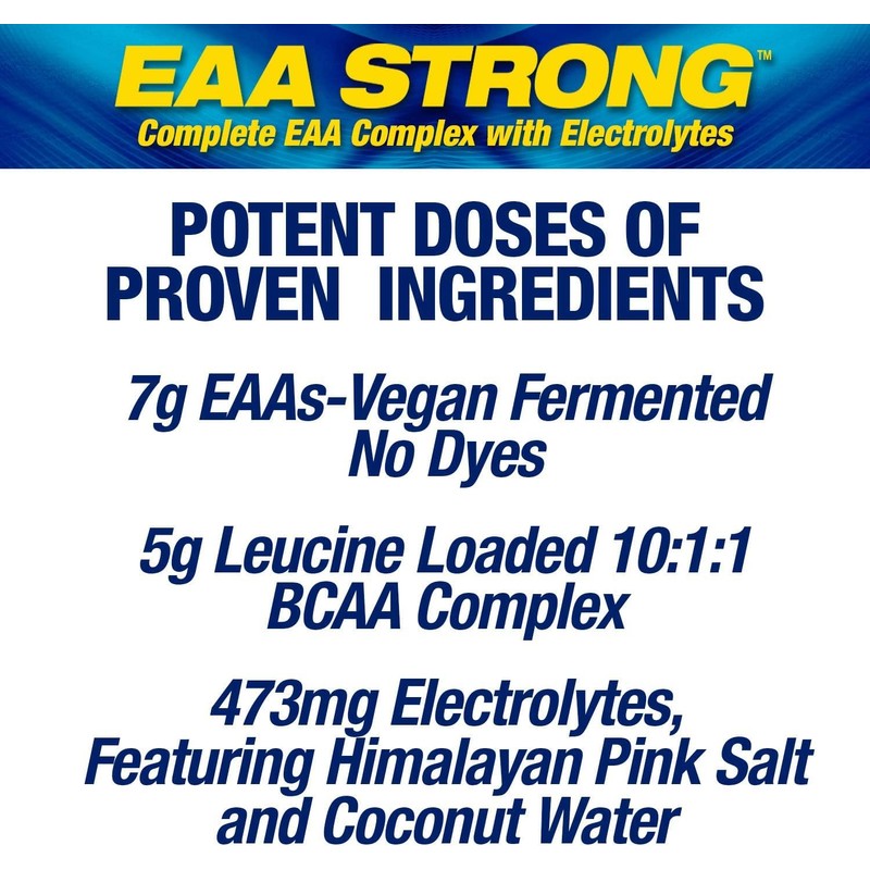 - Your complete and clean amino acid supplement: EAA strong is made from vegan fermented EAA's and contains no dyes. It mixes Instantly and is easy and convenient to use.