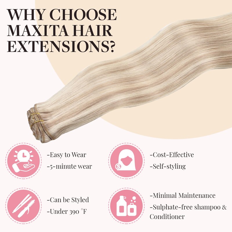 MAXITA Hair Extensions Clip in Human Hair,120g 7pcs Champagne Blonde to Bleach Blonde 16 Inch,Clip in Hair Extensions Real Human Hair Extensions Natural Straight Hair for Women