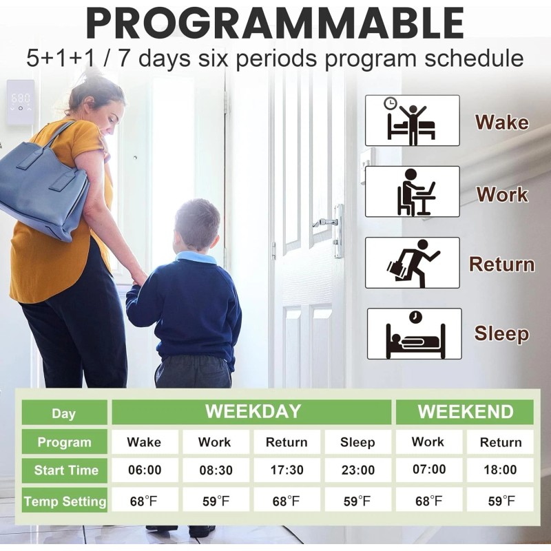 Programmable Customized Settings: This thermostat WIFI is an intelligent heating control device that allows you to precisely adjust the temperature to ensure comfort when you're at home and energy savings when you're setting up your thermostat's mode, you don't need to adjust it throughout the day manually. This level of control allows you to maximize energy savings on your heating bills.
