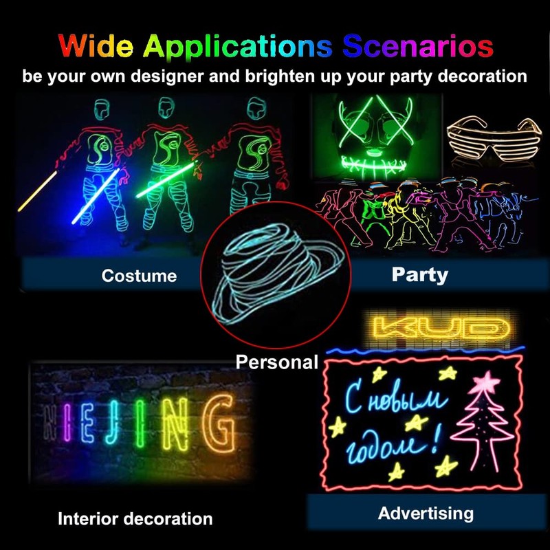 • [Safe and Durable] Electroluminescent Wire is easy to use and bright EL wire lights, no radiation, energy saving.the el wire kit is efficient lighting ,can used in clothing,diy,christmas or other festival,unleash yourself imagination for your versatile enjoy.