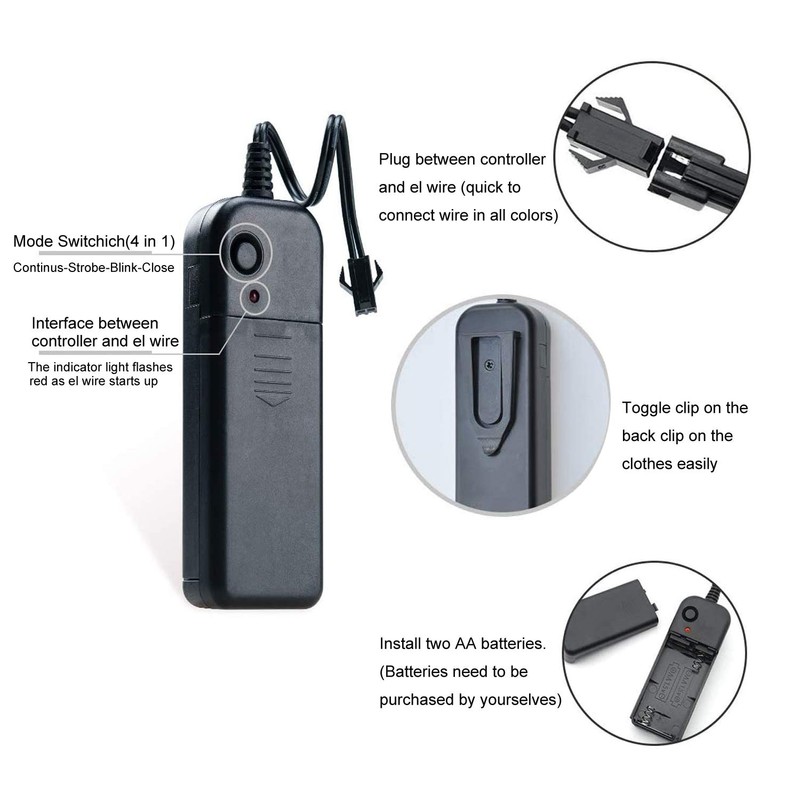 • [Battery controller 4 modes] The glowing wire Continuous ON/strobe/blink and OFF, can offer 360 degrees of illumination, by pressing the button on the battery pack.