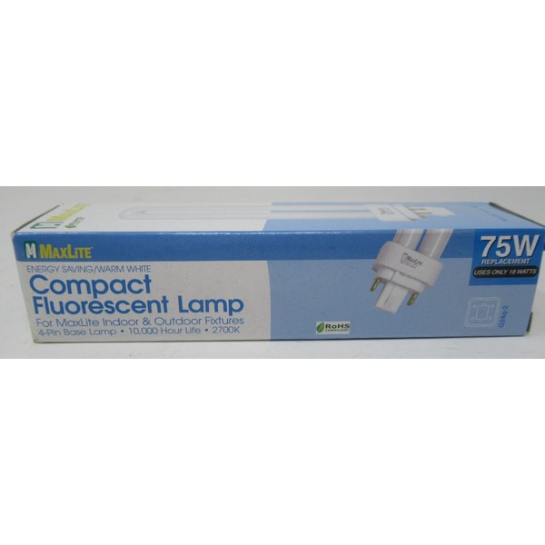 MAXLITE COMPACT FLUORESCENT LIGHT/LAMP WARM WHITE 4-PIN G24Q-2 BASE 2700K 18W MLDE 18/27. NEW IN THE BOX IN EXCELLENT CONDITION. SEE PICTURES CLOSELY FOR MORE DETAILS ON CONDITION. GETTING IT LIKE YOU SEE IT. A GREAT DEAL AT THIS PRICE.