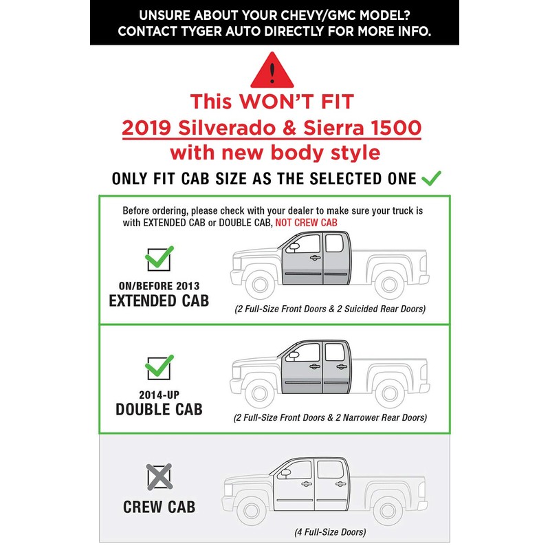 - IMPORTANT - Only fit Extended Cab & Double Cab with 2 full-size front doors & 2 narrower rear doors, NOT for Crew Cab with 4 full-size doors. (Please check the Cab Size picture.)