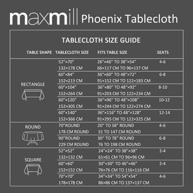 Available Sizes: Rectangle 52 x 70 inches, 60 x 84 inches, 60 x 104 inches, 60 x 120 inches, 60 x 140 inches; Square 52 x 52 inches, 60 x 60 inches, 70 x 70 inches; Round 70 inches, 90 inches.