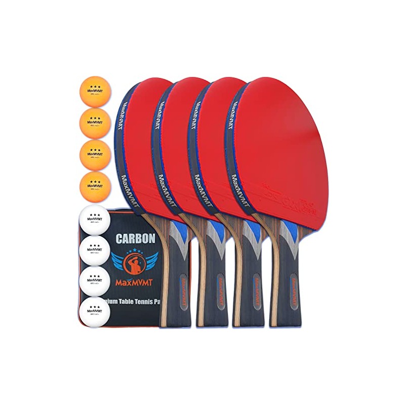 MaxMVMT MaxMVMT Ping Pong Paddle Set of 4 - Carbon Fiber 7 Ply Rackets - 2 Wristbands - 8 Balls - 1 Rubber Cleaner Sponge - Premium ITTF Approved Rubber - Complete 4 Player Table Tennis Setup - Carry Case