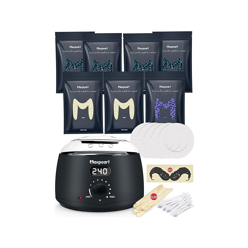 Maxpearl Digital Waxing Kit with 7 Packs of Hard Wax Beads for Brazilian, Bikini Waxing, Face, Eyebrows, Underarms, Arms, Chest, Back, Legs