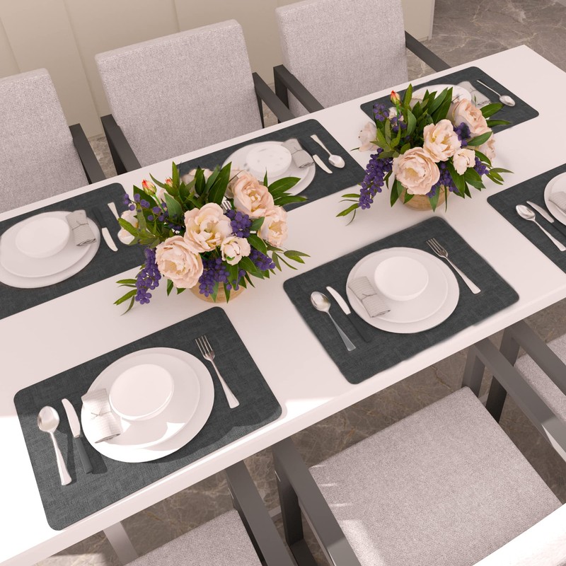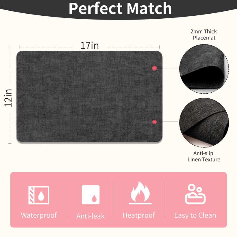 - EASY CARE: Designed for ease of use, these durable table mats withstand any spills and stains, making clean-up a breeze. Just with a simple wipe with a rag or a rinse under the tap, they'll be spotless and ready for your next meal.