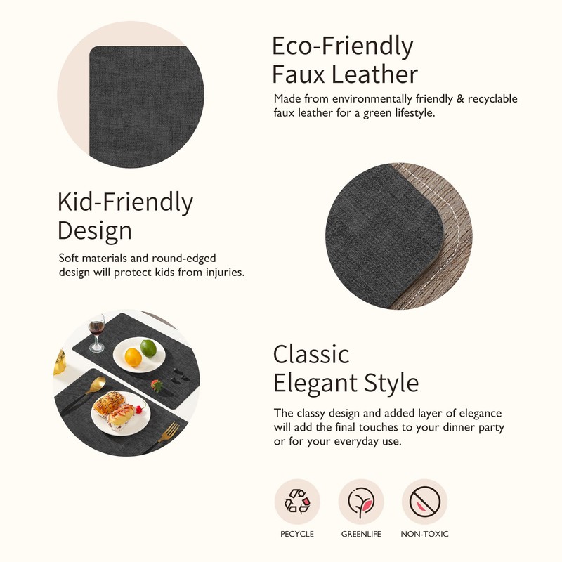 - Simple & Sophisticated - Made with premium faux leather, this placemats 4-pack features a solid design in a rich hue and pleasant textile touch that offers simple yet elegant addition and a splash of color for place settings. Perfect for use for both everyday meals and special occasions.