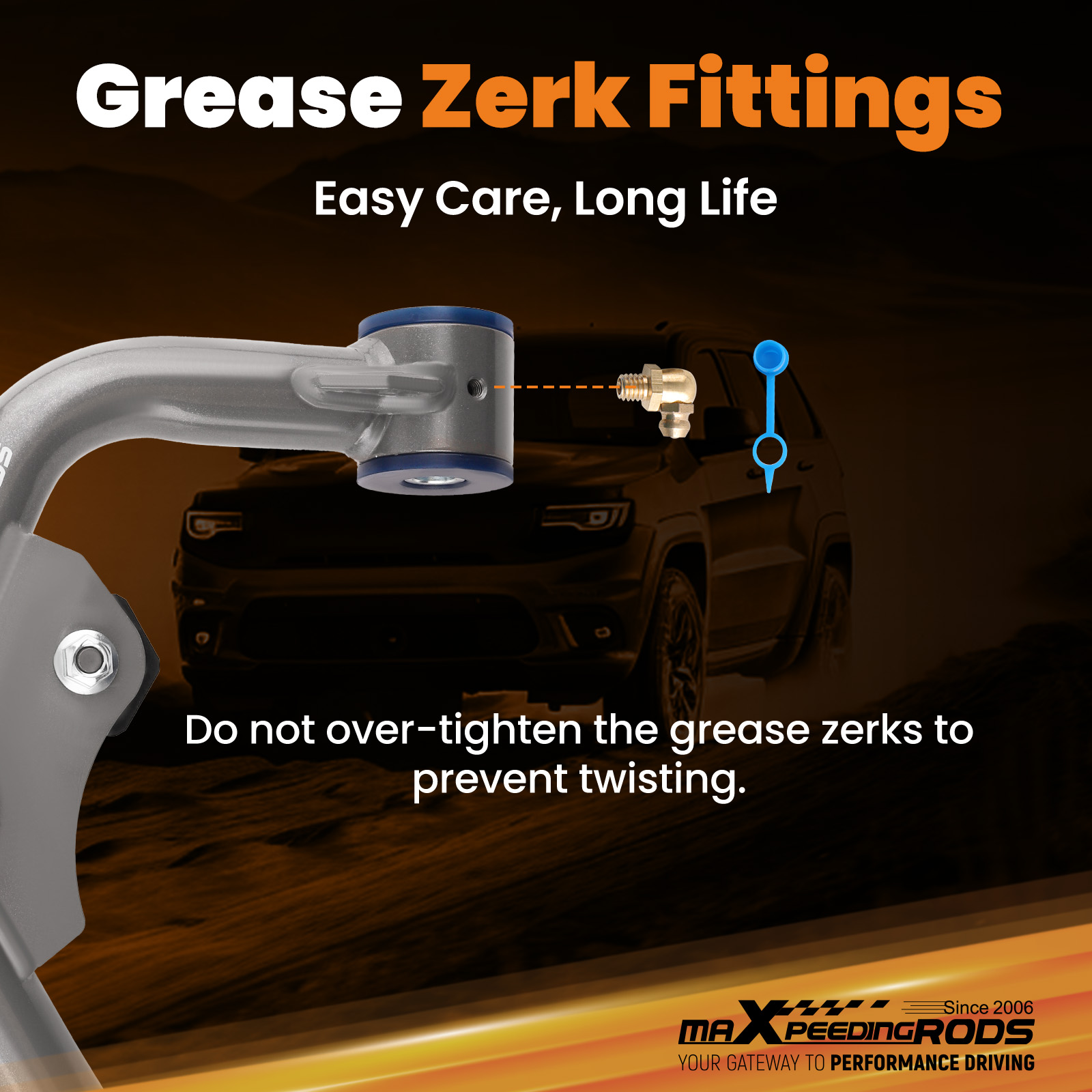 - Polyurethane Bushings, zert fittings for easy lubrication. Ball joints come with 90-degree zerk fittings