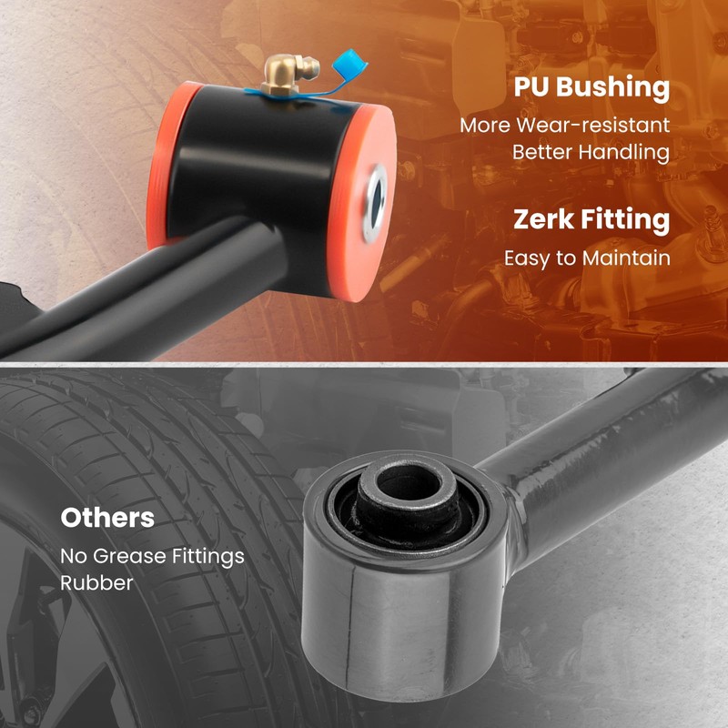 • Poly Bushing w/Zerk Fitting: More wear-resistant than normal rubber, longer service life. Designed to effectively eliminate abnormal squeaking noises for a sensitive driving quality