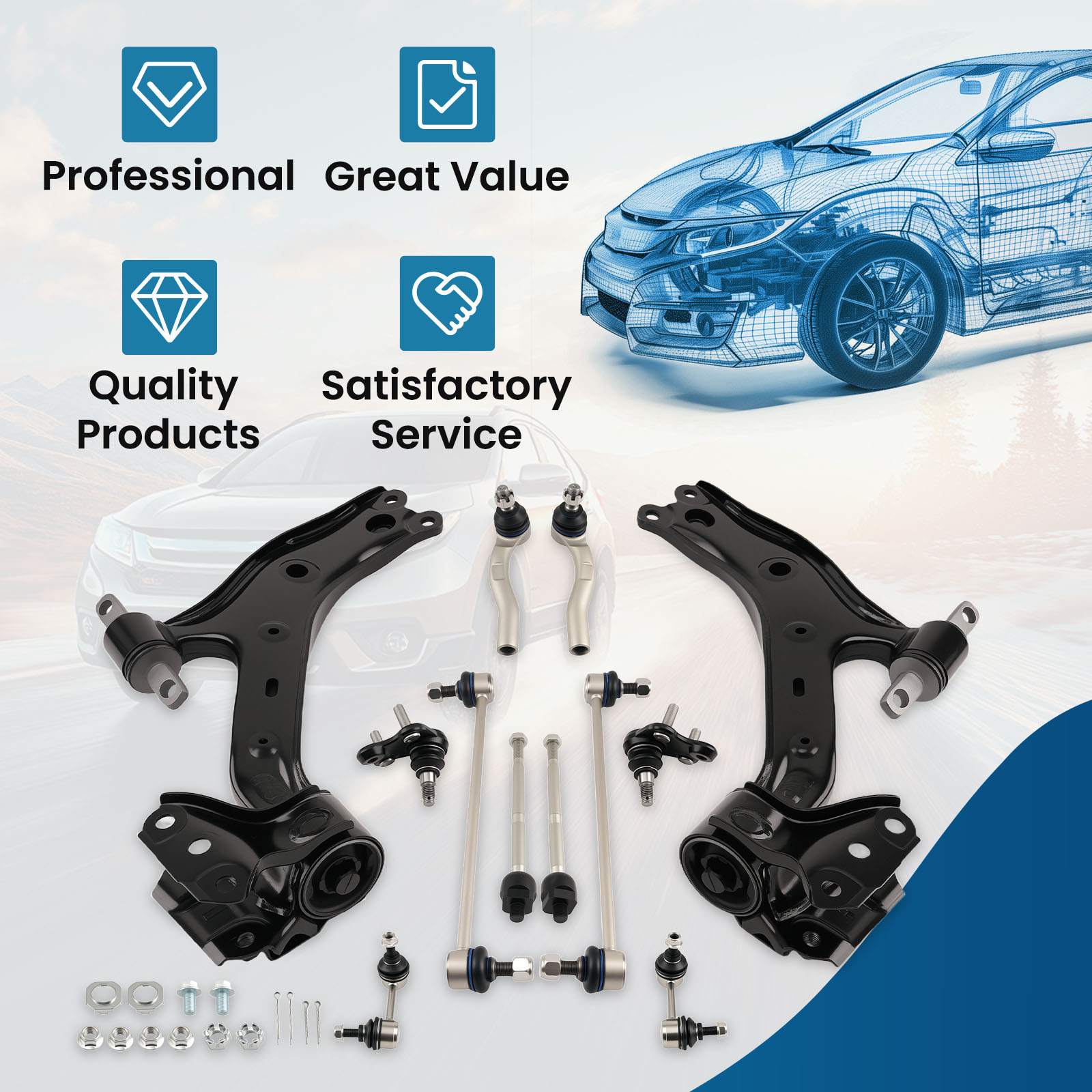 - Other Part Number: Front Control arms, Sway Bar Stabilizer Links,Outer Tie Rod