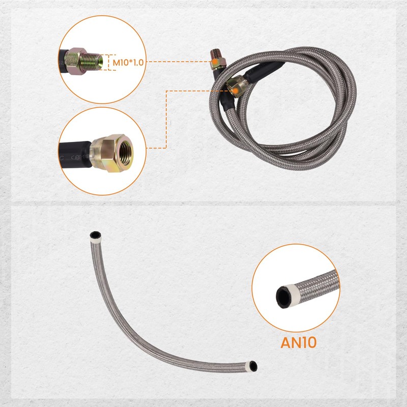 - 【Information】 Oil return line length: 550mm;Oil return line inner diameter: 21;Oil feed line length: 1000mm;Oil feed line inner diameter: 14;Hose end fitting: 10 AN