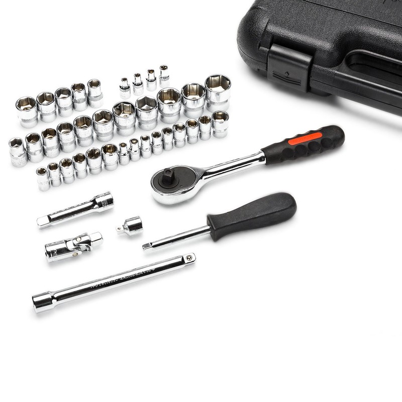 - RATCHETING HANDLE - Ergonomic anti-slip ratcheting handle with quick release and reversible switch, 3/8" adapter included