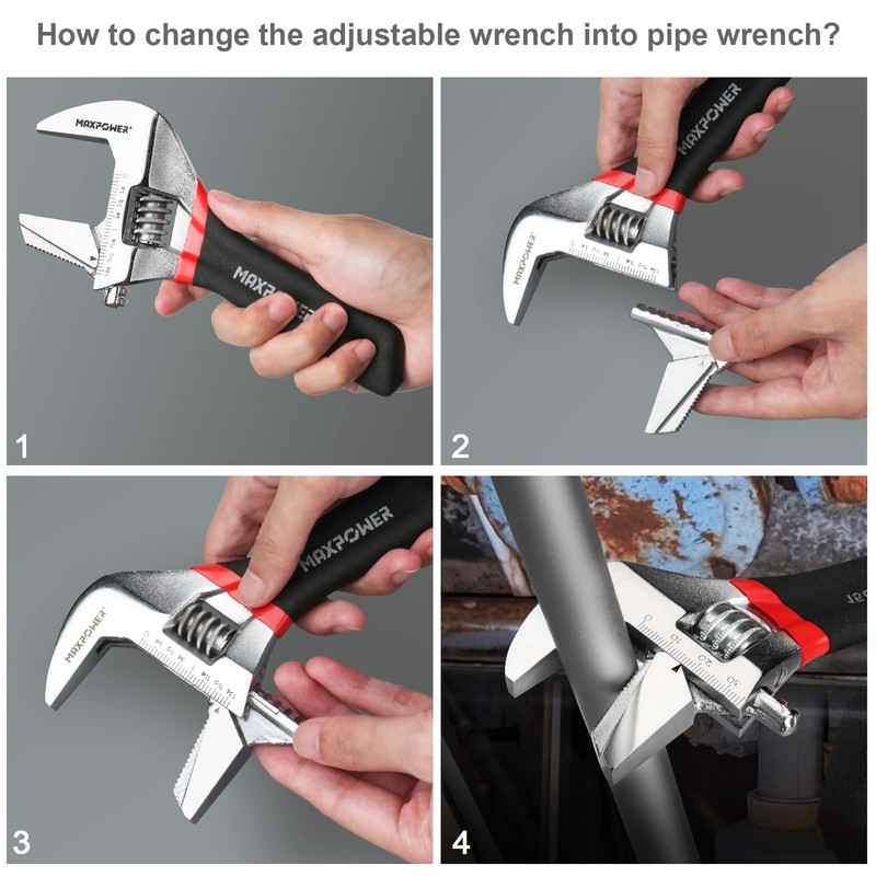 - 【REVERSIBLE JAW DESIGN】- The wide opening reversible jaw with serrated edge makes it possible for griping round screws or pipes. It can be used as an adjustable wrench and a pipe wrench for mechanics, plumbers or DIY enthusiast.