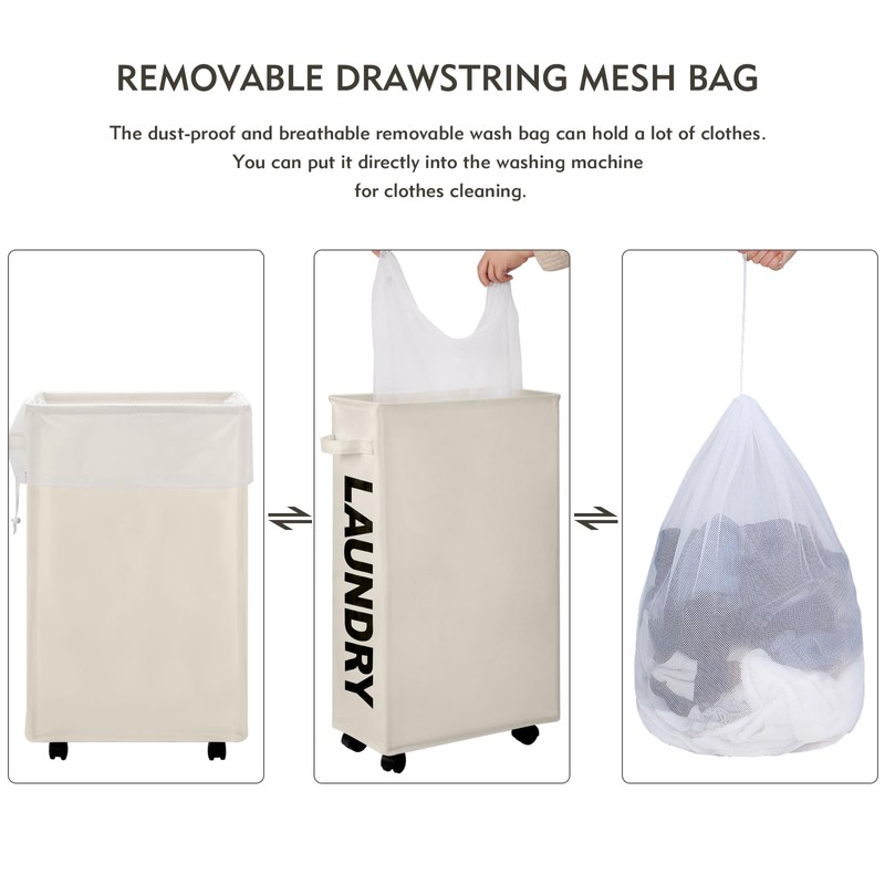 - Moderate Size: With dimensions of 16"(L) x 9"(W) x 29"(H) / 40.5 x 23.5 x 73.5CM, this slim rolling laundry basket neither occupies too much space nor compromises on its capacity, making it suitable for daily storage needs Its slender exterior is suitable for placement in narrow spaces, such as bathroom corners or beside wardrobes, maximizing space utilization