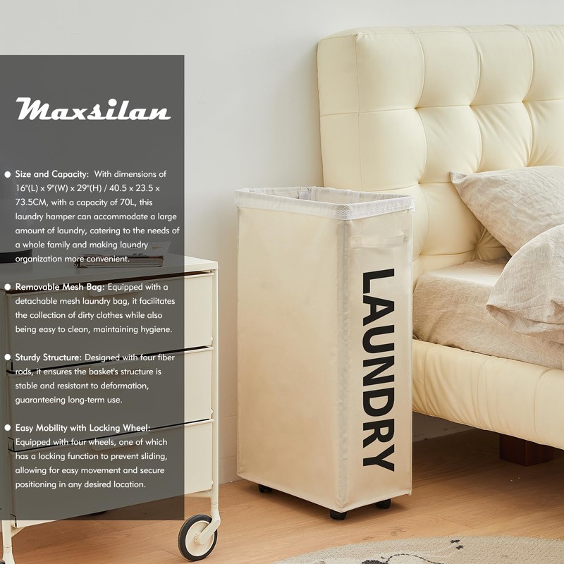 Maxsilan 29" Slim Rolling Laundry basket with Removable Bag on Wheels, 70L Collapsible Narrow Corner Laundry Hamper, Foldable Storage Bins, Beige