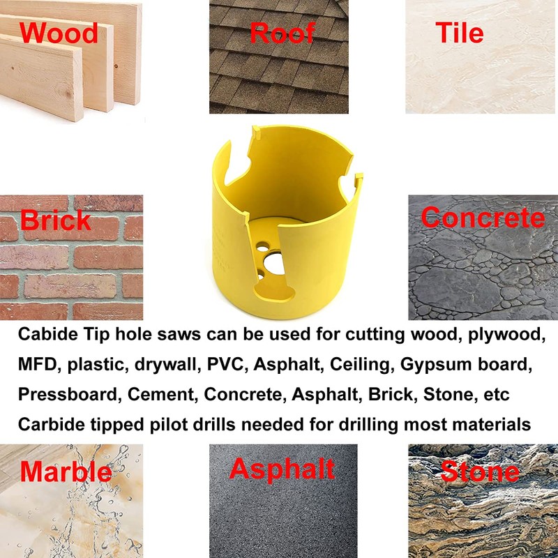 - MaxTool Carbide Tipped Holesaws are the best for drilling in asphalt, brick, concrete, dry wall, gypsum, Limestone, marble, MDF, tile, wood, composite, plastic, etc; Carbide Tip Pilot Drill bit is required for cutting some materials (Not included)
