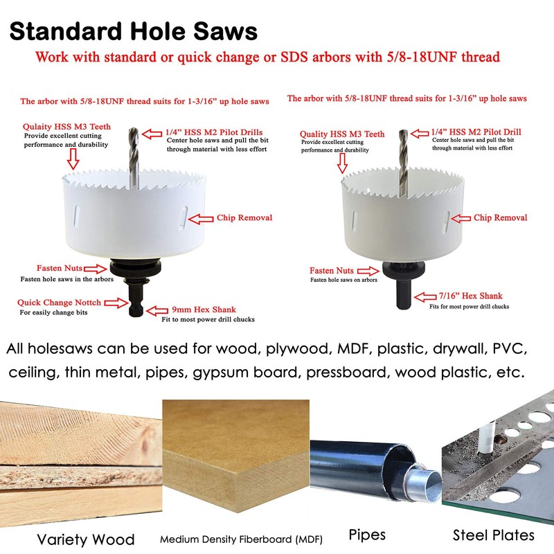 - The best cutting result for drilling in the thin metal sheet, pipe, plastic, wood, composite, etc. Not for Asphalt, Brick, Concrete, Tiles, etc